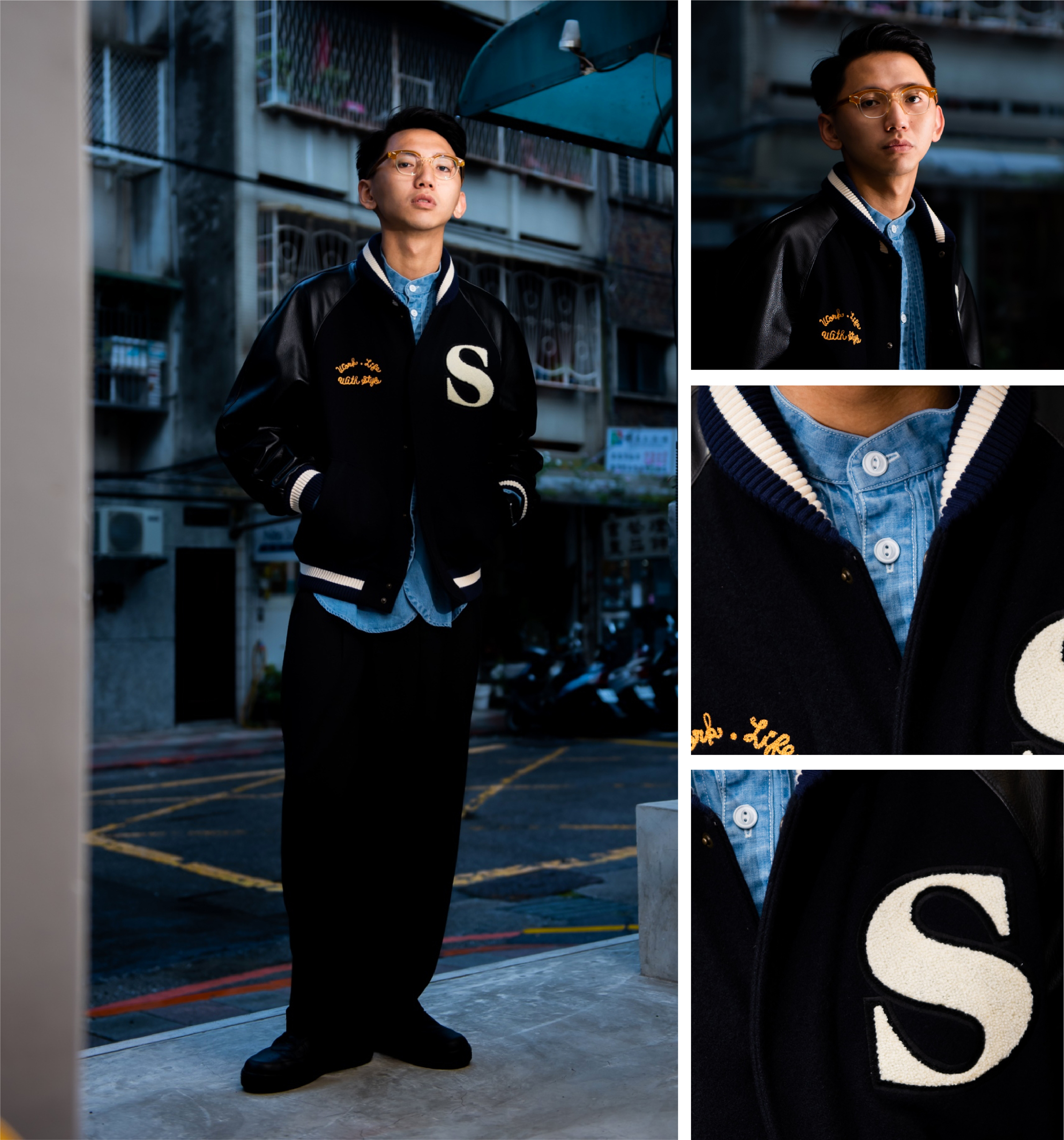 「紅色皮革棒球夾克散發濃厚學院風格,相當吸睛。」