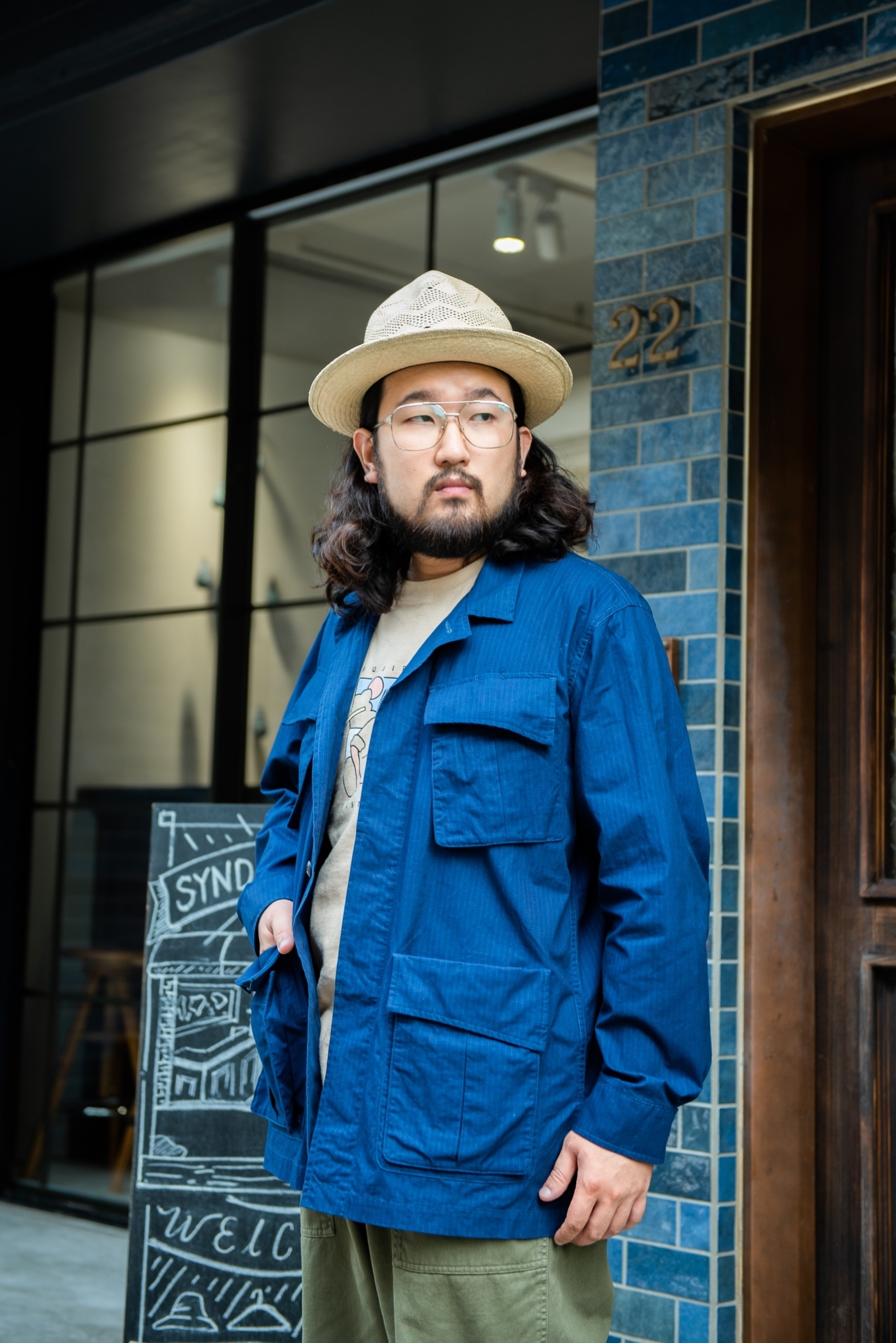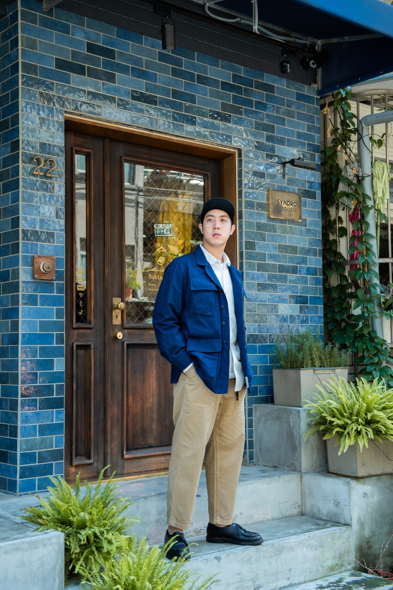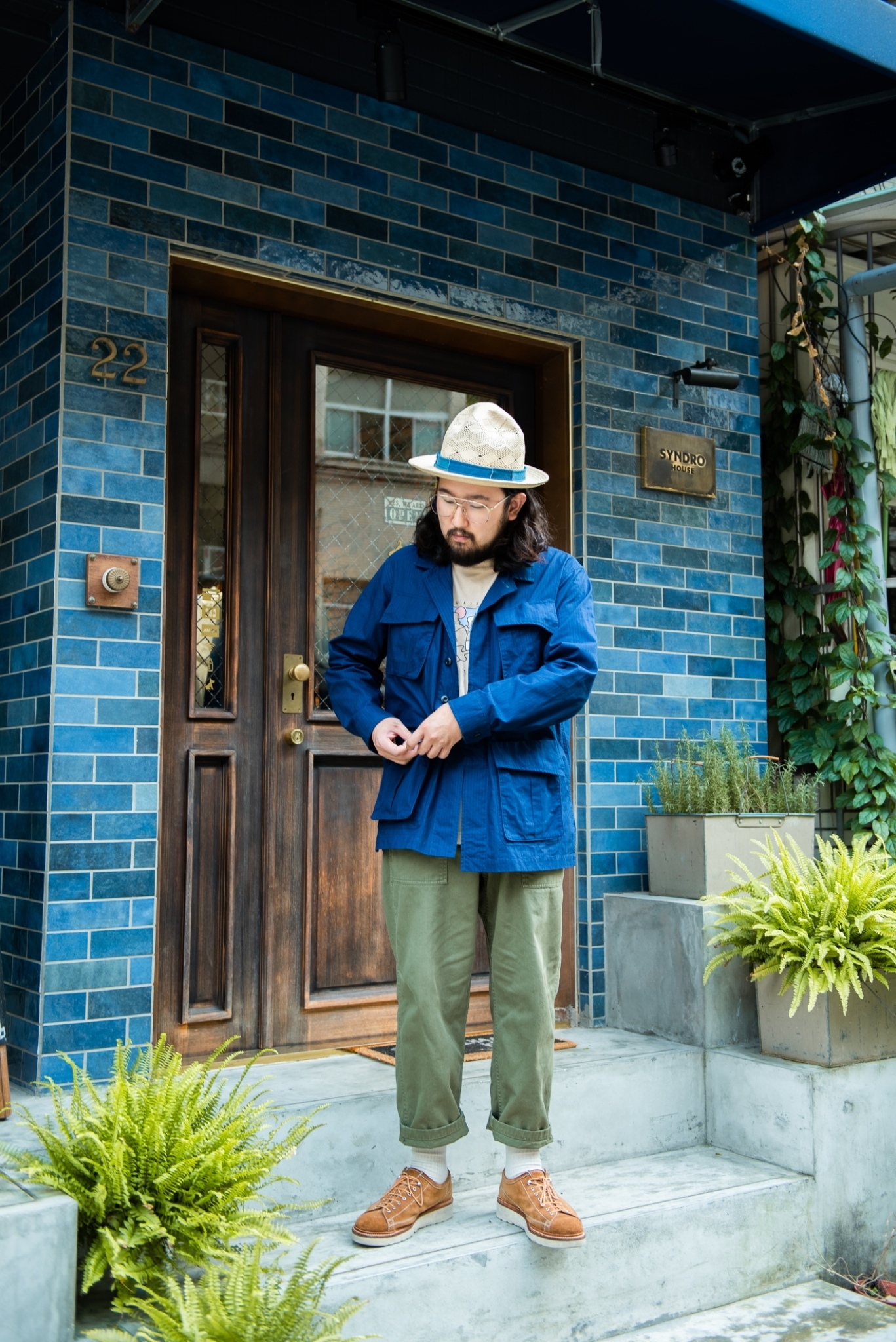 “JUNGLE” 六口袋夾克本身也帶著這樣的味道,原先為越戰經典野戰夾克的樣式,但經版型調整及藍染後多了數分斯文質調,搭配上些許寬鬆的軍綠長褲、夏日風情的草帽及份量感十足的棕色靴款,在斯文及粗獷兩者中取得平衡。