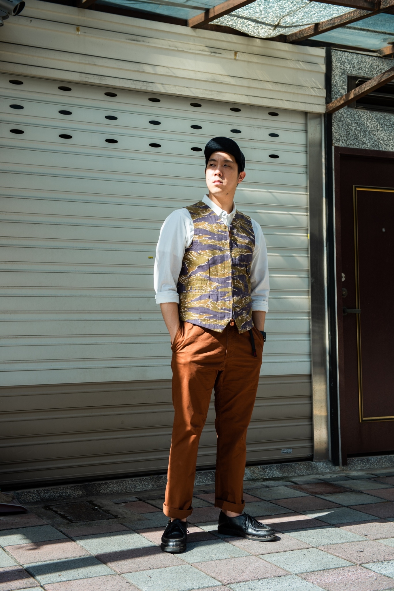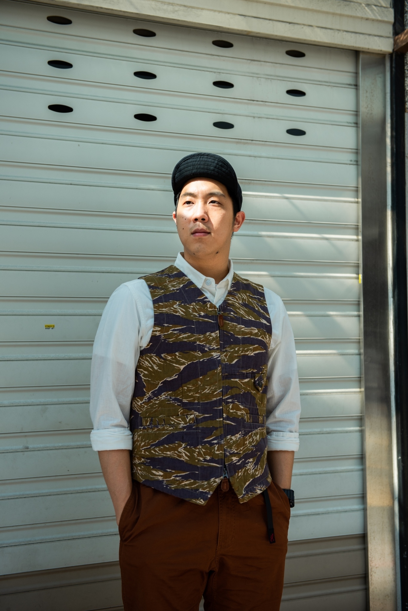 將內搭的 “OLD MINER” 工作襯衫紮進褲頭,單穿可能會略微正式,不過在外頭罩件 “BREATH HOLDER” 軍背心後便能稍稍降低單薄感,純棉人字紋的迷彩布料少見之外,也十分具有老品氛圍及質感。