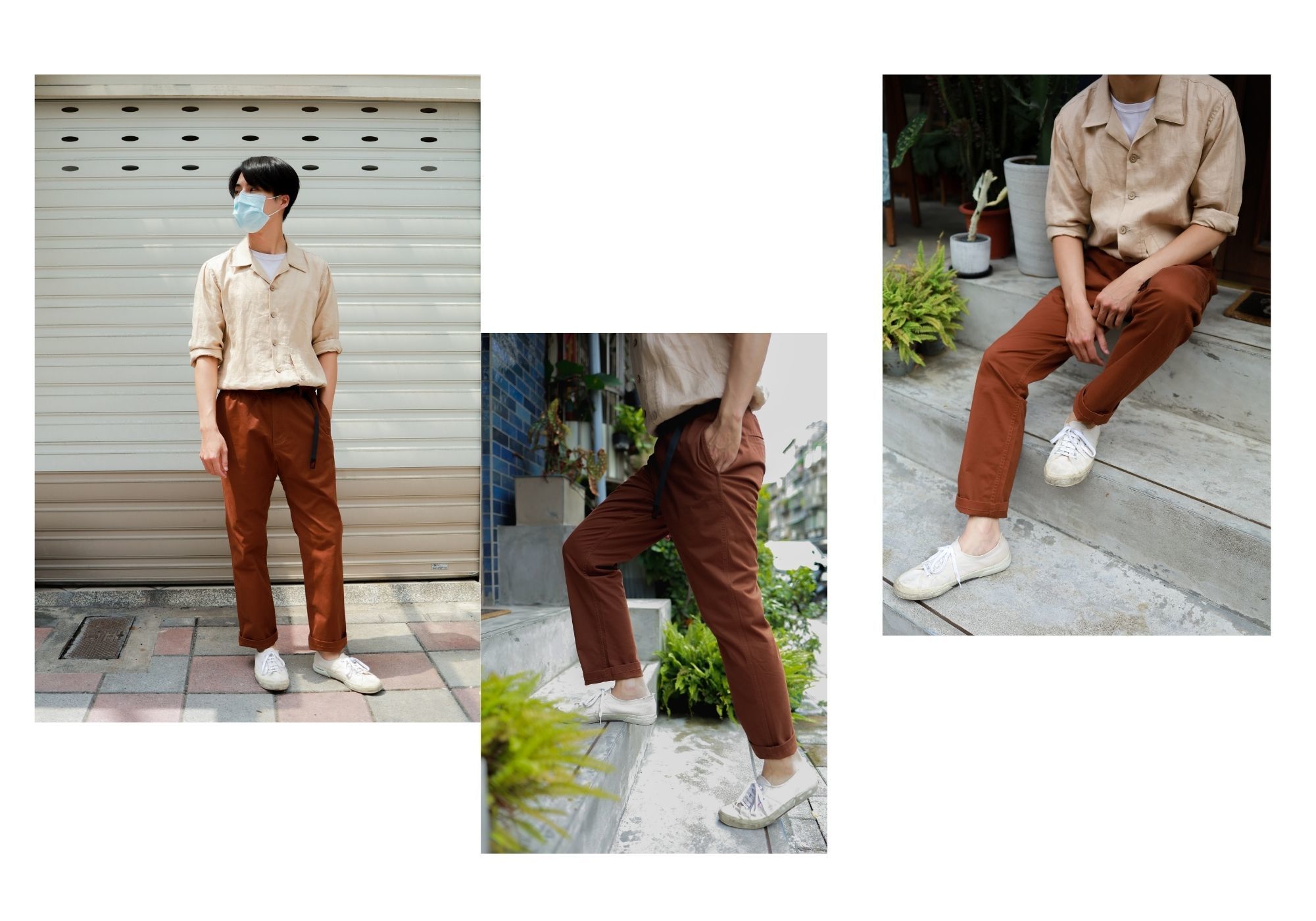 配上一條深褐色的 NN-Pants Just Cut 長褲,上下一致的棕色調,彷彿宣告著秋天的來臨。如果想添增一些正式感,可將襯衫紮入褲頭,而簡單的白色帆布鞋則為視覺帶來平衡,更為乾淨清爽。
