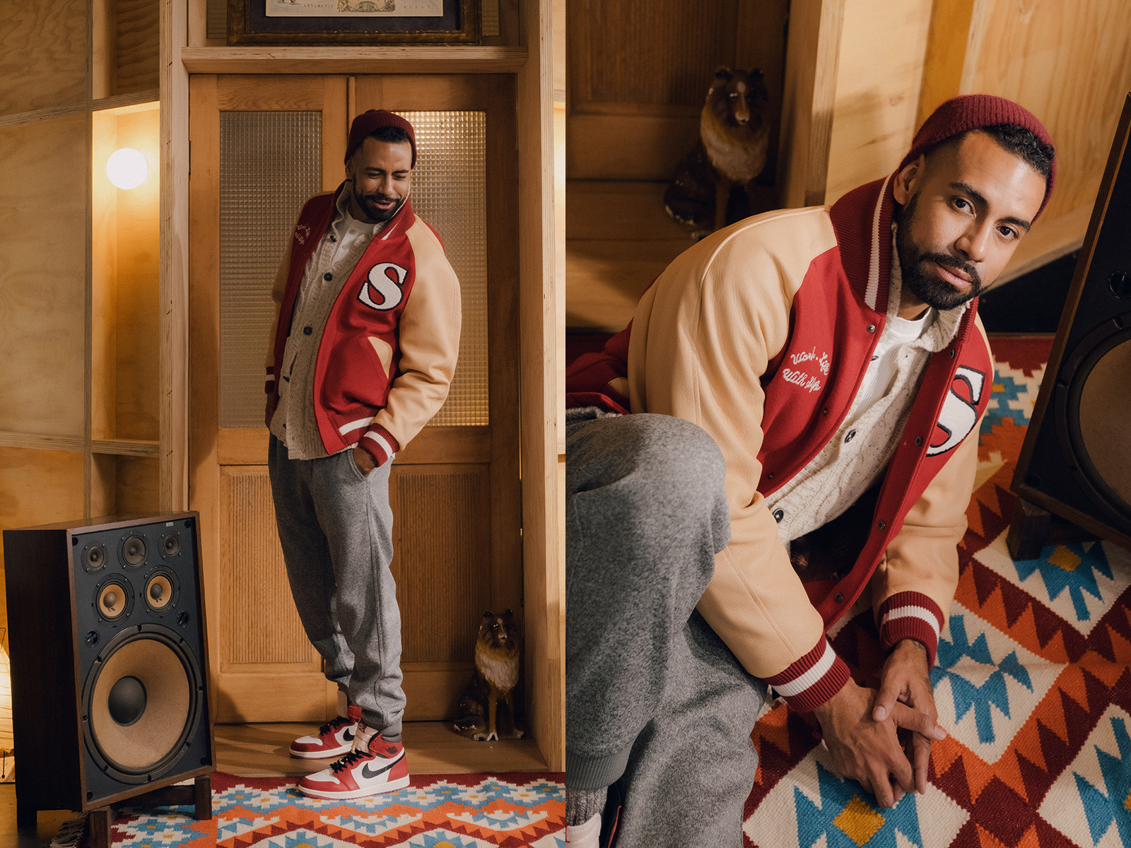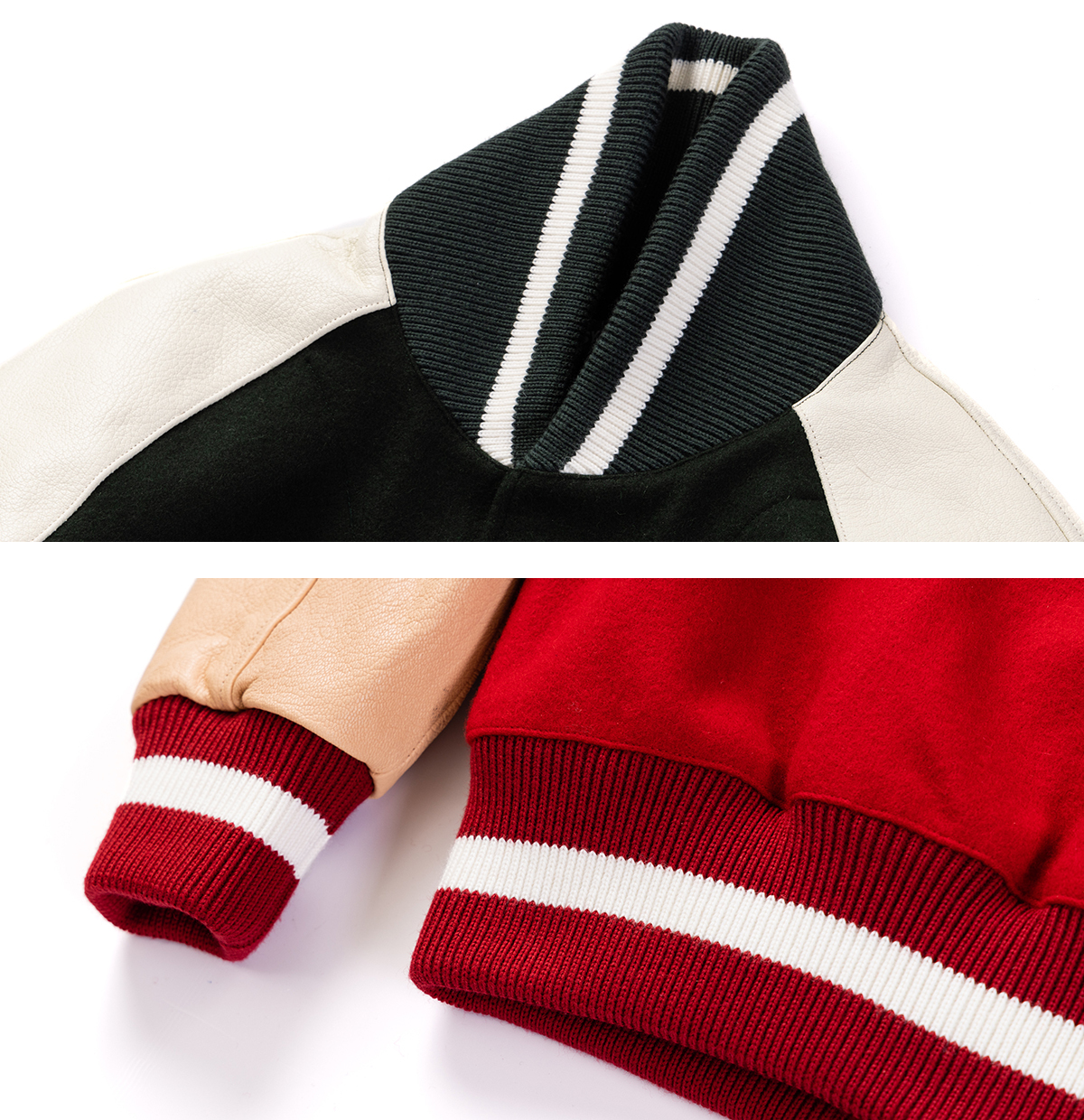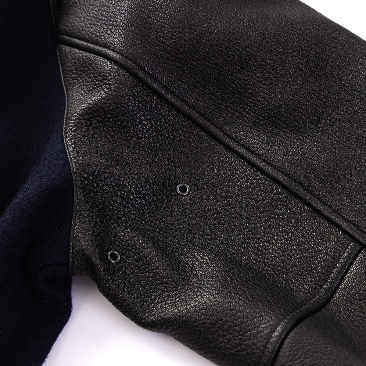 “STRIKE” 採 raglan 連肩袖設計,棒球夾克最具代表的特徵 — 皮袖,2023 年版以柔軟富彈性的野生鹿皮製做;